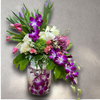 Este es un arreglo floral de estilo asimétrico y tipo cascada, que combina la elegancia de las orquídeas con la frescura de los tulipanes y las rosas. La técnica de incluir flores sumergidas en el jarrón le da un toque moderno y artístico