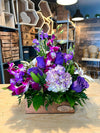 Immerse yourself in the magic of Sweet Violet! This floral arrangement includes elegant roses , radiant tulips , delicate hydrangeas , wonderful astromelias , exotic dendrobiums (orchid flowers), seductive lilies and a touch of curly willow and wax flower to give the final touch to the wonderful journey of this composition on a base in wood. Explore the delight that the power of nature offers!