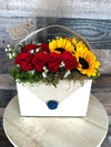 Enamórate del "Flovers Bag". Un hermoso arreglo floral simulando un bolso de tela y madera, combinado con hermosas rosas rojas y (3) tres girasoles frescas que te animarán el día. Descubre la maravilla de un nuevo día y regala un detalle que cuente.