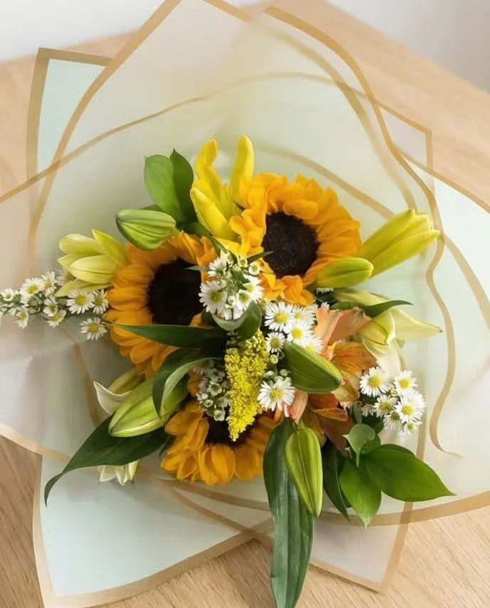 Descubre Mini Detalle Para Él, con una base dorada de aluminio que incluye rosas azules, tulipanes, un girasol, solidagos y greenballs ¡Es el regalo perfecto para el hombre apasionado en tu vida!
