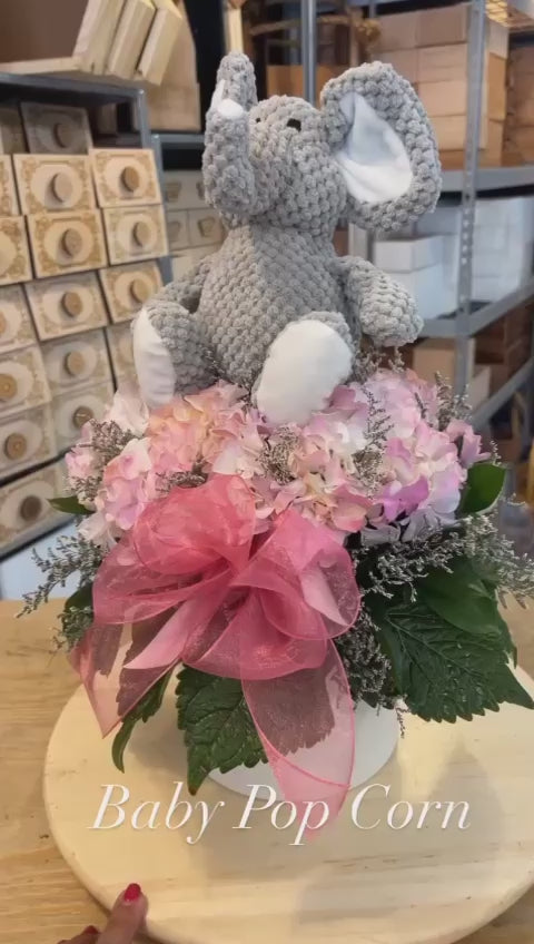 Floral arrangement (Pop Corn) with a base composed of hydrangeas in green, pink and blue colors.