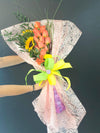 ¡Dile a esa persona especial cuánto la amas con este llamativo bouquet! El papel mallas envuelve una mezcla de rosas y girasoles, dejando un detalle elegante y tierno. ¡Un impresionante regalo que no dejará indiferente!