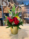 Anima tu casa con este Detalle floral. Hecho con el esmero que caracteriza a nuestros productos, este hermoso arreglo con base en metal que incluye rosas, tulipanes y solidagos. ¡Es vista y perfume que rejuvenecerán tu espacio!