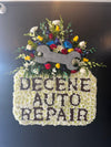 Mechanical Workshop es una corona funeraria personalizada para honrar a los seres queridos. Mide 32"x 32". Está preparada con un surtido de rosas, anastasias, gerberas, solidagos, dendrobiums (flor de orquídea) y stock de alta calidad, para satisfacer requerimientos de los más exigentes. Esta hermosa muestra de respeto y admiración es una forma adecuada de homenajear a los seres queridos.