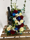 Esta caja de madera está llena de un vibrante arreglo de rosas, y dendrobiums (flor de orquídea), ruskus y wax flower. El regalo perfecto para cualquier ocasión, acompañado por una deliciosa botella de vino tinto.