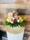¡Te damos la bienvenida al mundo, beba! Este regalo precioso celebra la llegada de una niña hermosa a sus vidas. Incluye rosas, astromelias (lirios peruanos), un (1) girasol, green balls, solidagos y stock en una base plástica rectangular en *color blanco o rojo y un peluche.